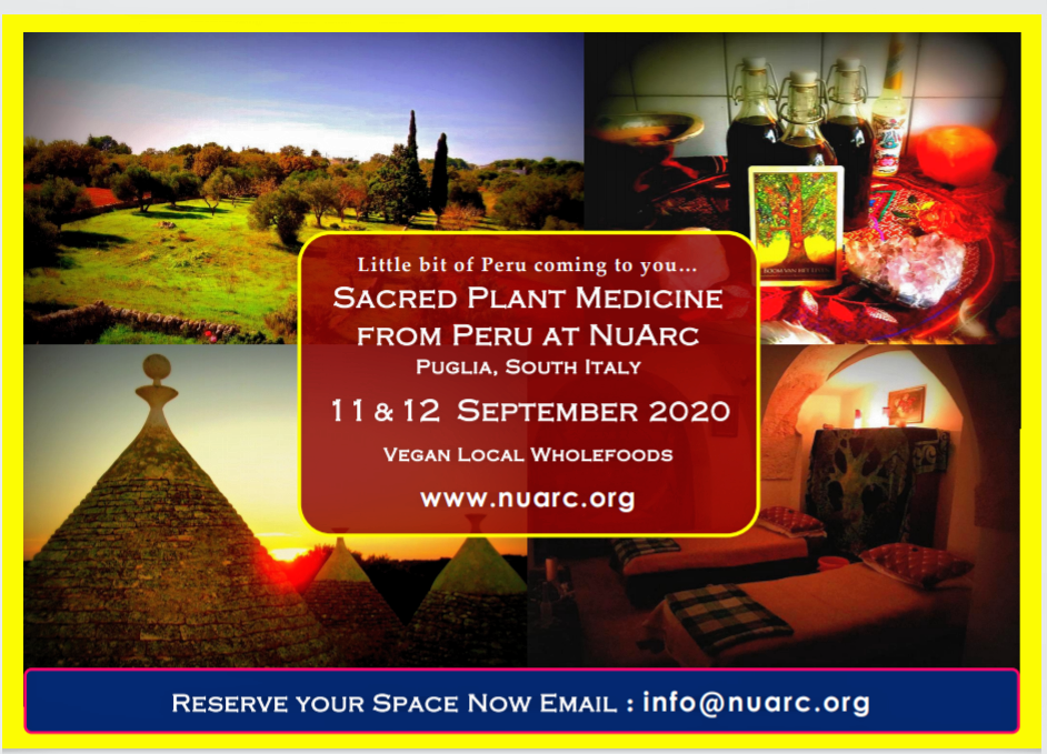 Bit of Peru coming too You, a Vegan weekend of Sacred Peruvian Traditional medicine set in the tranquil and beautiful rural countryside of Puglia South Italy at NuArc.org the plant based project .